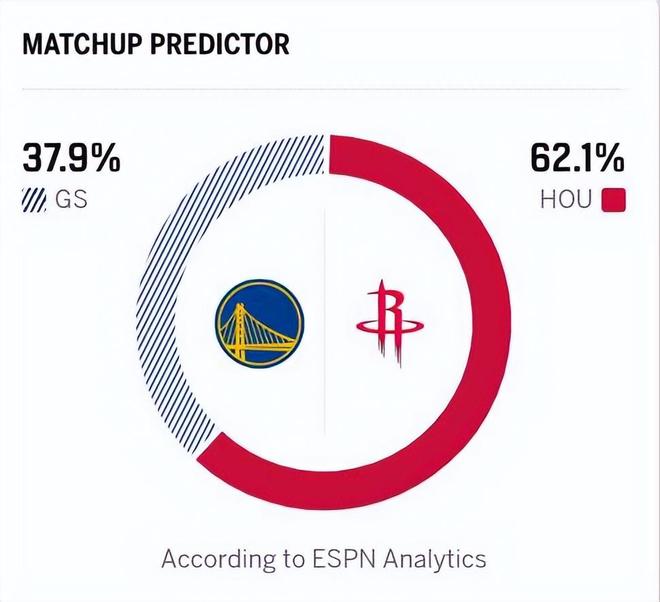 北京时间3月6日,NBA常规赛迎来一个话题度拉满的对决,休斯顿火箭主场对阵金州勇士,此役也是全美直播!不过由于勇士缺少库里、巴特勒、波津,顶多算勇士的第三阵容,赛前,外界普遍看衰勇士,ESPN赛前更是预测,勇士取胜概率只有37.9%,火箭胜率高达62.1%!但是,没想到,一场一边倒的比赛,最终爆出了大冷门。勇士以一套残阵出战,让火箭输得颜面无存。